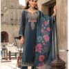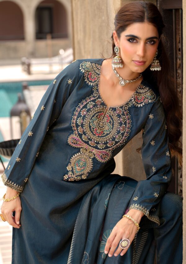 Ariana Designer Blue Simmer Silk Suit with Hand Embroidery & Floral Dupatta