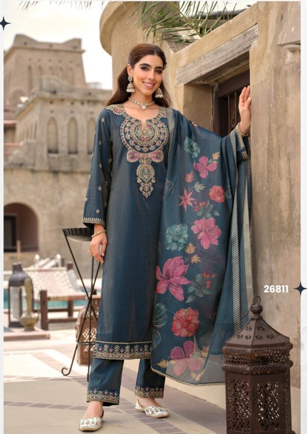 Elevate your festive look with the Lily & Lali Ariana Designer Suit, an elegant creation blending rich fabrics and intricate craftsmanship. With its premium simmer silk base, hand embroidery, and floral dupatta, this suit is designed for women who love timeless grace with modern flair.