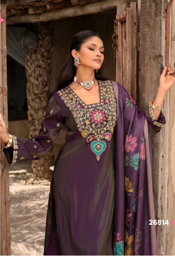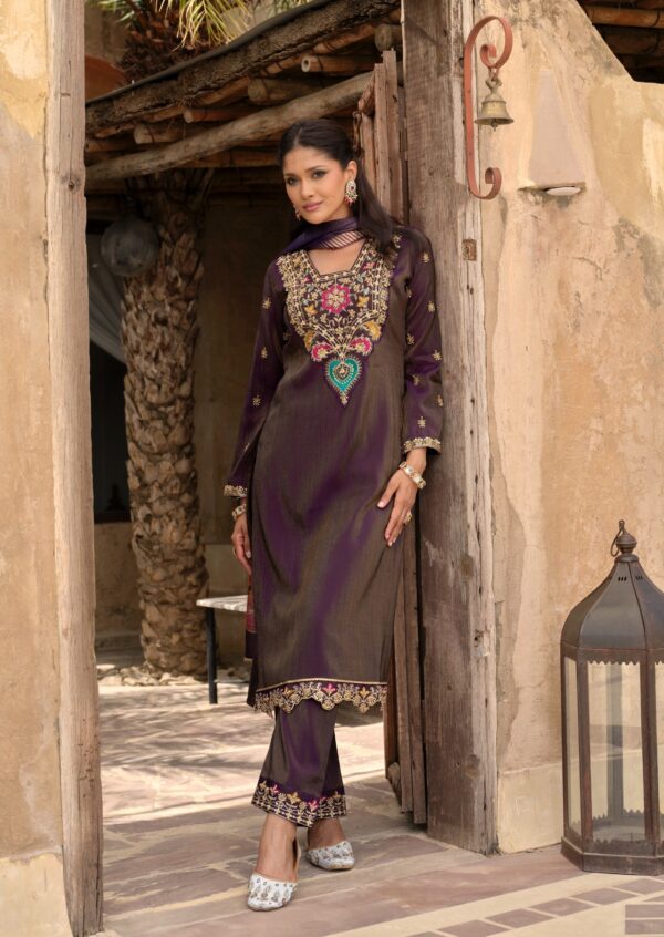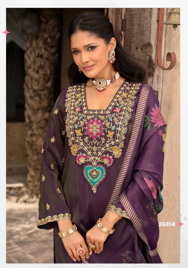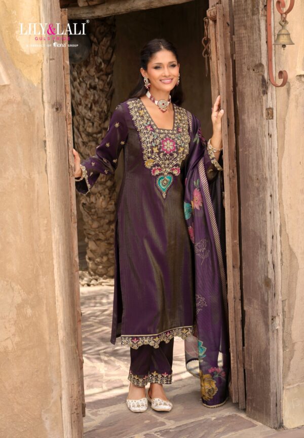 Elevate your festive look with the Lily & Lali Ariana Designer Suit, an elegant creation blending rich fabrics and intricate craftsmanship. With its premium simmer silk base, hand embroidery, and floral dupatta, this suit is designed for women who love timeless grace with modern flair.