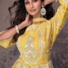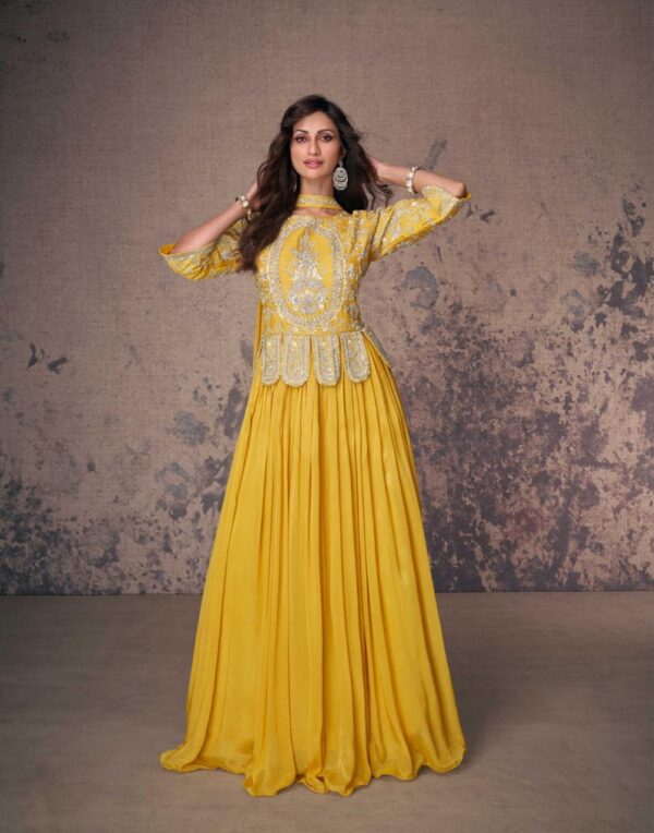 Shine in this Aroma yellow Indo Western gown featuring intricate silver embroidery, peplum-style detailing, and a flowing floor-length silhouette. Perfect for festive and wedding occasions.