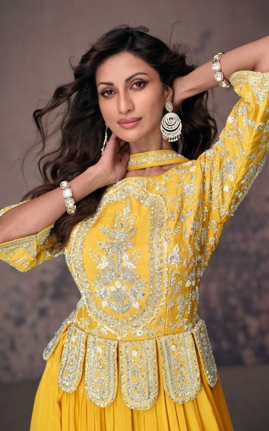 Radiate elegance and grace with this exquisite Aroma Indo Western gown in a vibrant shade of yellow. The outfit showcases intricate silver embroidery on the bodice, highlighted with a unique peplum-style design that adds a modern twist to traditional wear. The flowing floor-length skirt drapes beautifully, creating a regal and sophisticated appeal.
