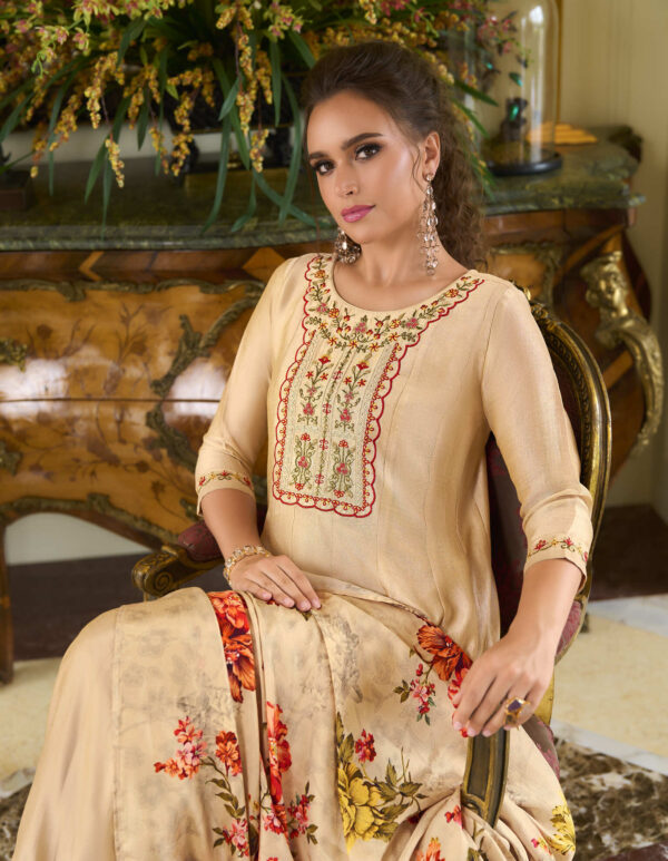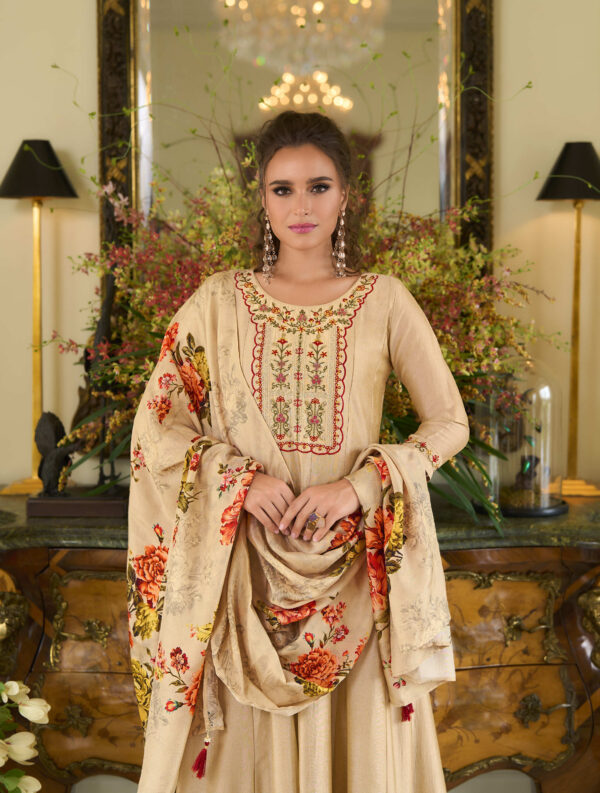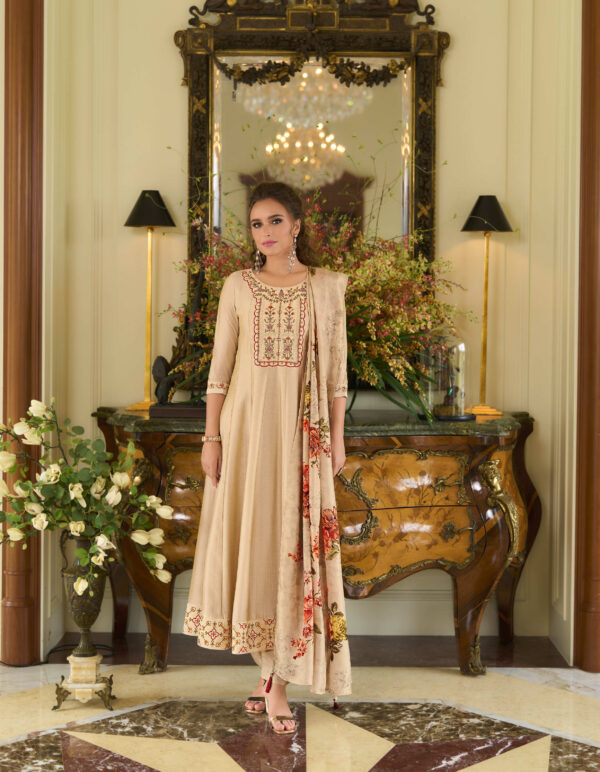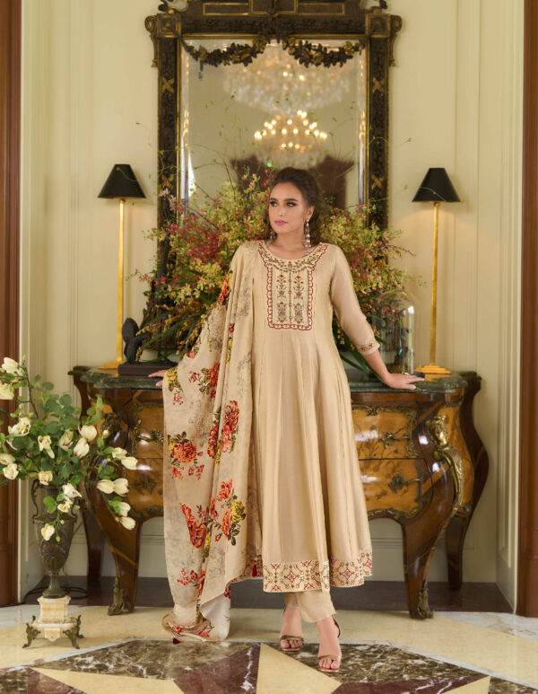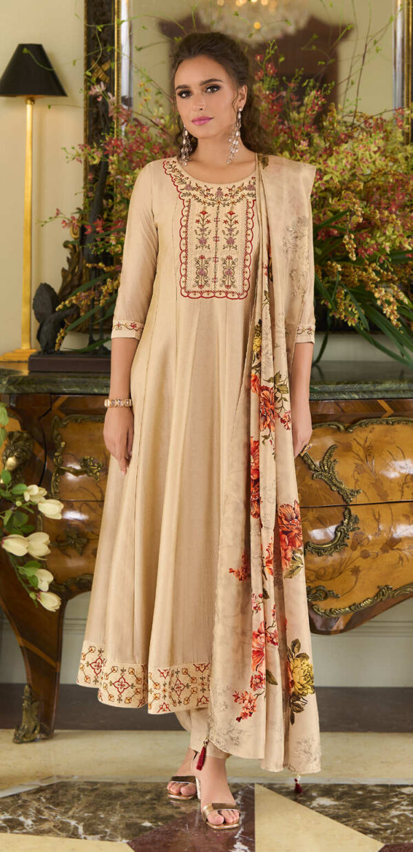 Step into elegance with the Begum Jaan Beige Suit. Crafted from premium fabric with intricate embroidery, this ethnic dress offers a graceful fit and flare silhouette. Perfect for weddings, festive occasions, and parties, it combines traditional charm with modern style. Pair with statement jewelry and heels for a complete festive look.