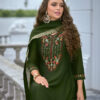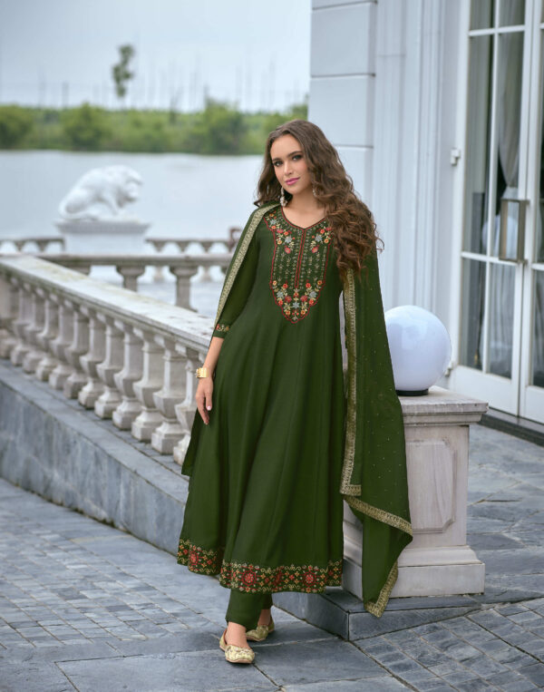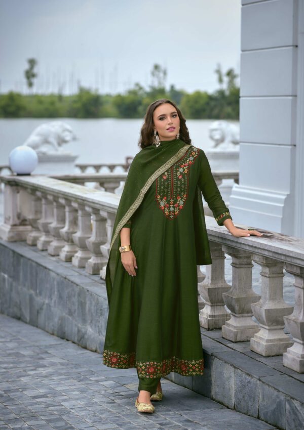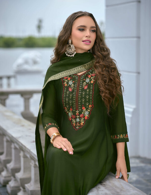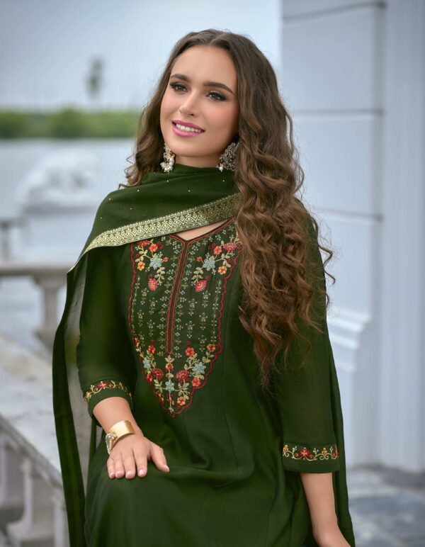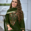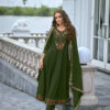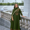 Step into elegance with this stunning Dark Green Bibbojaan suit, adorned with intricate embroidery and delicate embellishments, perfect for festive and formal occasions.