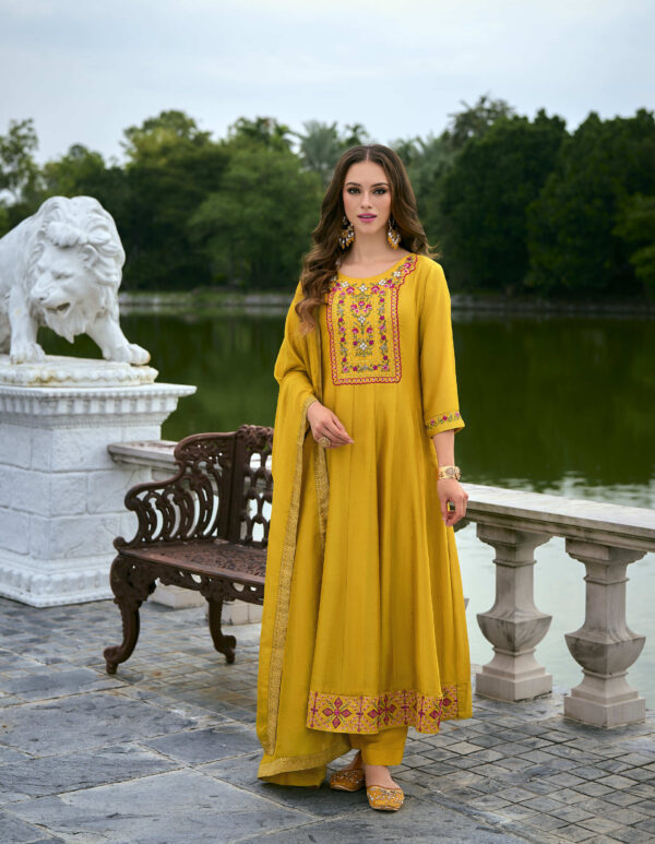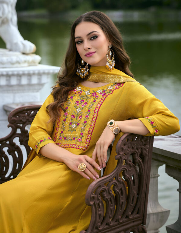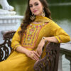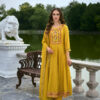 Step into elegance with this stunning Mustard Bibbojaan suit, adorned with intricate embroidery and delicate embellishments, perfect for festive and formal occasions.