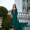 Step into elegance with this stunning teal green Bibbojaan suit, adorned with intricate embroidery and delicate embellishments, perfect for festive and formal occasions.