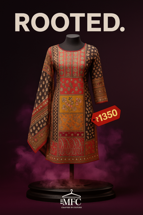 Radiating a blend of tradition and artistry, the Gulposh Patchwork Charm suit celebrates the beauty of handcrafted elegance. Featuring a mesmerizing patchwork of floral prints in shades of crimson, mustard, olive, and earthy tones, it evokes the timeless charm of Mughal-inspired gardens. The flowing silhouette, crafted from breathable and lightweight fabric, offers both comfort and grace, making it perfect for festive gatherings, cultural occasions, and sophisticated day wear. The round neckline and full sleeves accentuate the intricate print arrangement, while subtle gold-toned accents and statement earrings complete the regal ensemble. A true statement piece for the modern woman who cherishes tradition with a contemporary touch.