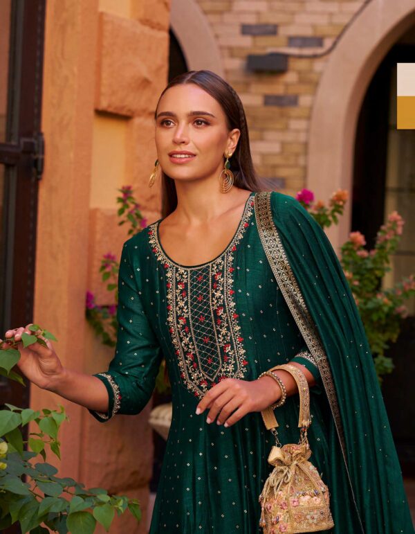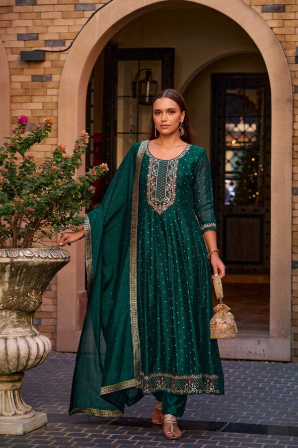 Make a statement at every occasion with our elegant dark green Anarkali Suit for Women. This exquisite ethnic outfit is designed to offer both style and comfort, crafted from high-quality fabric that drapes beautifully. The suit features intricate embroidery on the bodice and hem, highlighting traditional craftsmanship with a contemporary touch. Its flowing silhouette and flattering flare make it ideal for weddings, festivals, family gatherings, and festive celebrations.