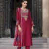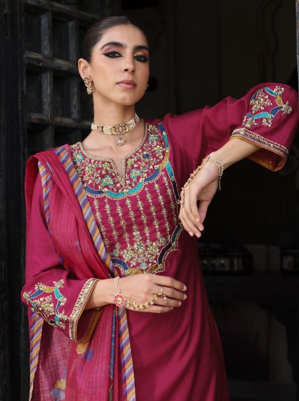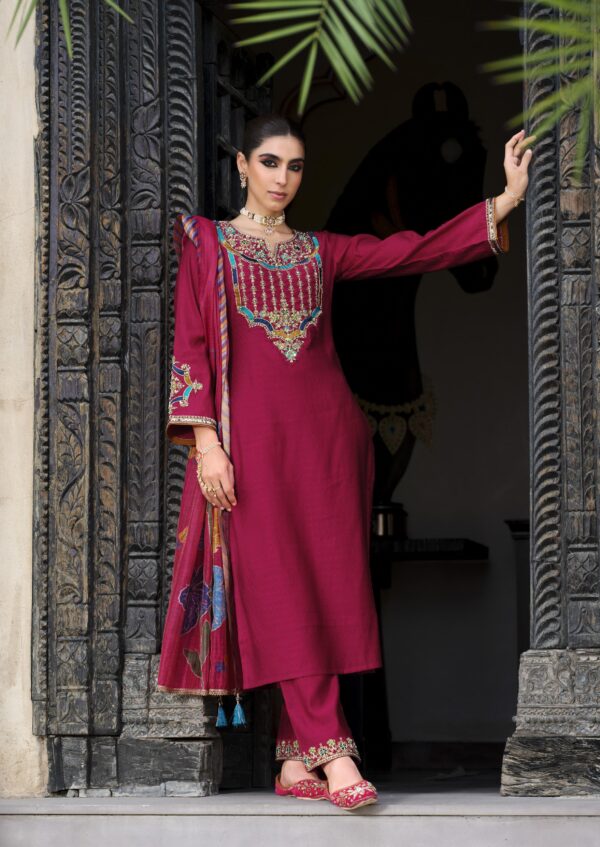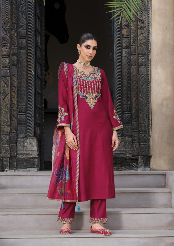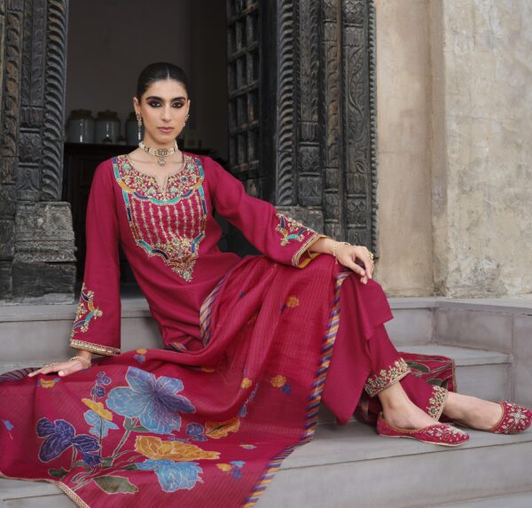 Elegant Deepika Designer Mahroon Silk Suit by Lily & Lali, crafted from premium silk fabrics with exclusive handwork. Comes with a floral print dupatta, stylish embroidery, and comfortable cotton lining.