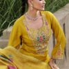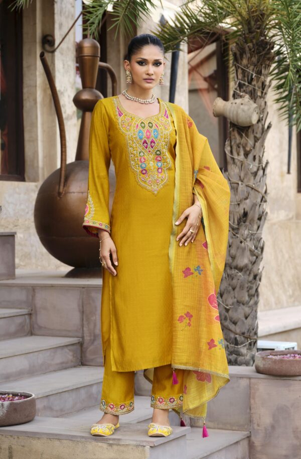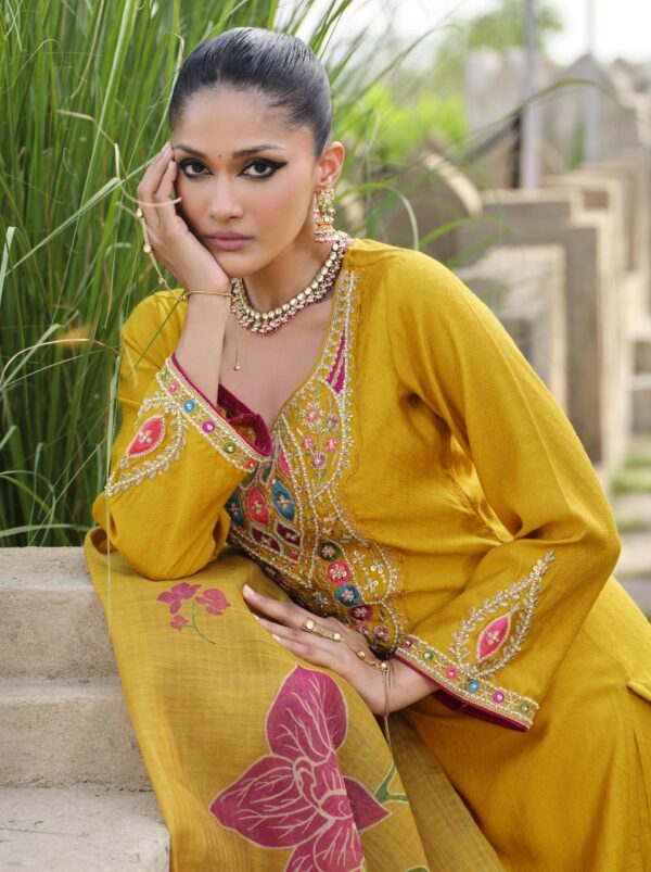 Deepika Designer Mustard Silk Suit with Handwork & Floral Print Dupatta