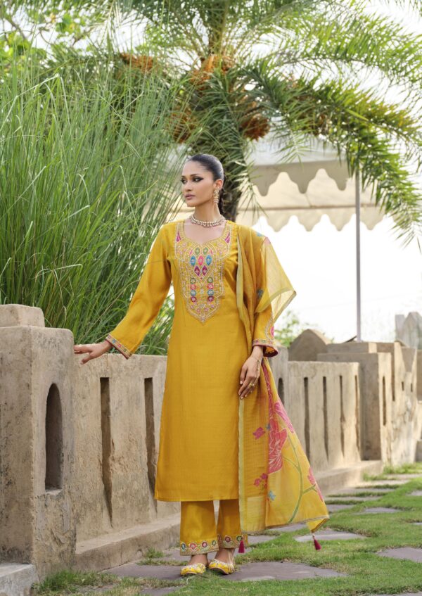 Elegant Deepika Designer Mustard Silk Suit by Lily & Lali, crafted from premium silk fabrics with exclusive handwork. Comes with a floral print dupatta, stylish embroidery, and comfortable cotton lining.