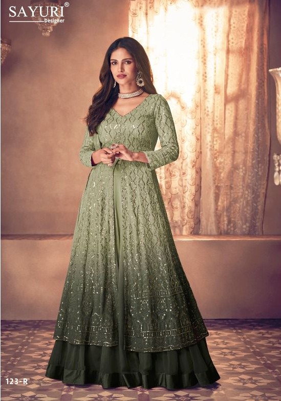 Embrace modern elegance with this stunning Indo Western Anarkali gown in a sophisticated shade of green. Designed with a flattering V-neckline and full sleeves, the outfit is beautifully adorned with intricate sequin embroidery that adds a luxurious sparkle. The floor-length flared silhouette with a layered hemline gives a royal touch, making it ideal for weddings, receptions, cocktail parties, and festive celebrations.