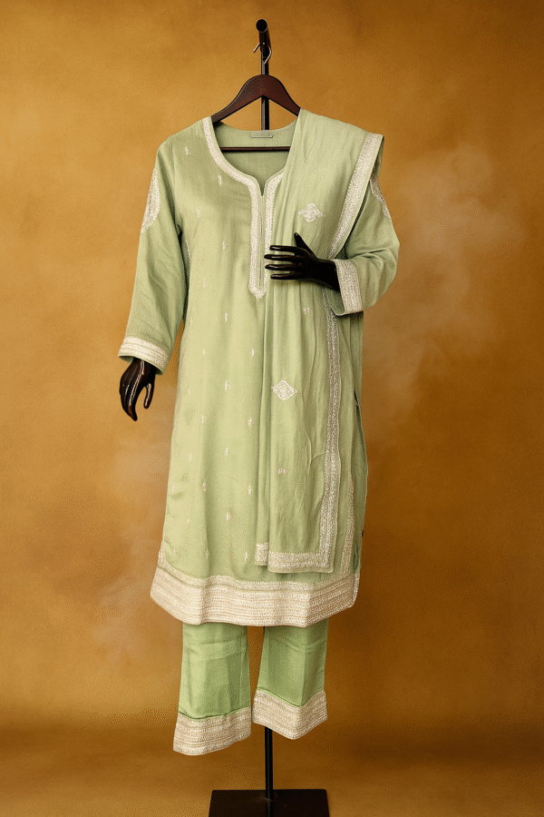 A radiant green sheer fabric suit adorned with intricate white embroidery and delicate detailing, perfect for festive and formal occasions.
