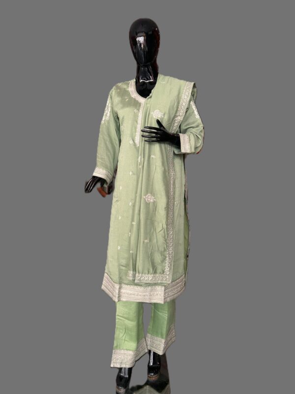 Step into timeless elegance with this stunning Green sheer suit set, crafted from lightweight, breathable fabric that drapes beautifully. The kurta features subtle hand-embroidered motifs throughout, complemented by a delicately bordered dupatta and coordinated straight pants. The shimmering threadwork on the neckline, sleeves, hem, and dupatta edges adds a refined touch of traditional charm. Ideal for daytime festivities, weddings, or cultural gatherings, this ensemble offers both grace and comfort, making it a standout piece in your ethnic wardrobe. Pair it with jhumkas and traditional footwear for a complete festive look.