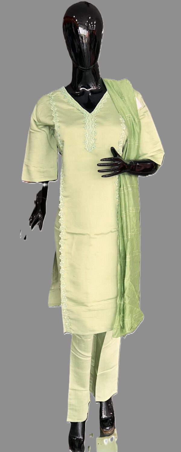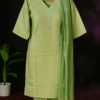 A graceful light green cotton suit set featuring delicate embroidery on the neckline and sides, paired with a matching straight pant and dupatta. Perfect for casual elegance and festive charm.