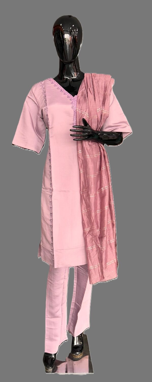 Elevate your ethnic wardrobe with this elegant pink suit set from the Rooted Collection. Crafted from premium cotton fabric, the kurta showcases fine embroidery along the neckline and sides, adding a touch of sophistication to its minimalist design. The straight-cut pants ensure all-day comfort, while the lightweight dupatta with subtle woven stripes completes the look with effortless grace.
