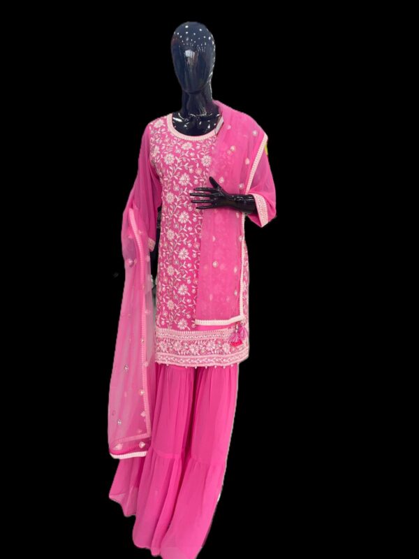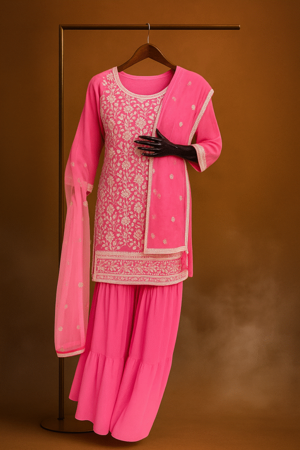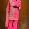A vibrant Pink sharara suit in soft modal fabric, featuring intricate embroidery and a delicate embroidered dupatta — perfect for festive and celebratory occasions.