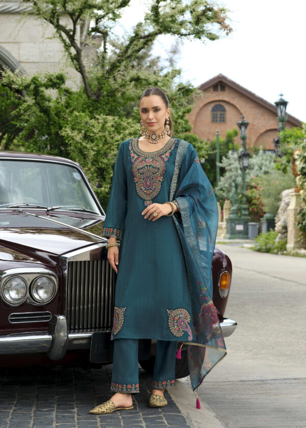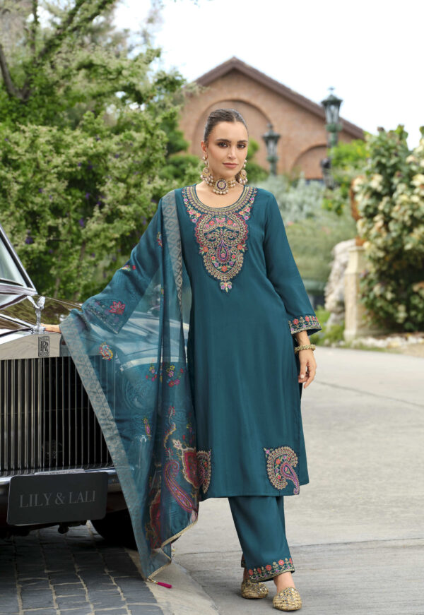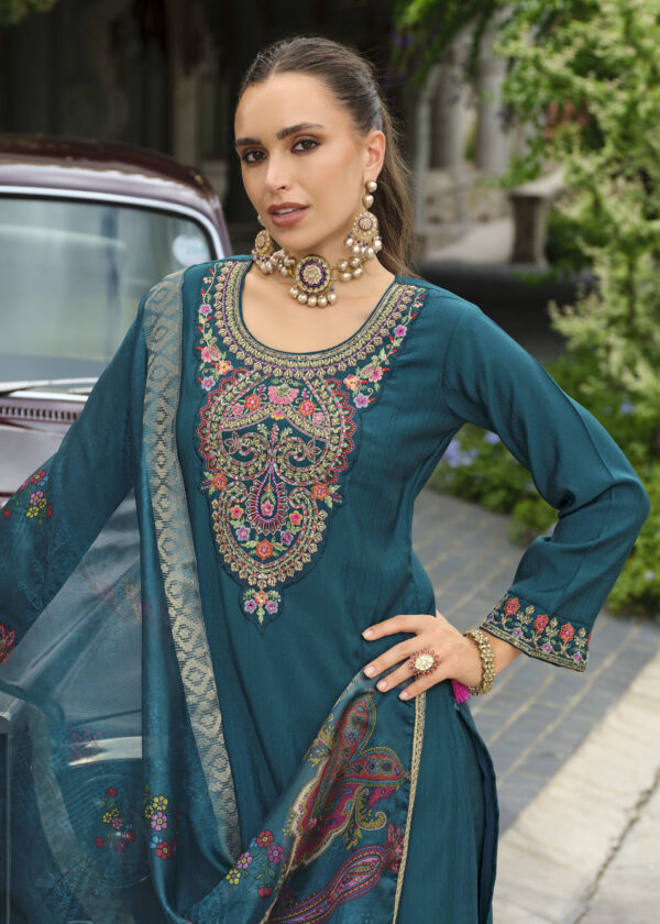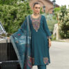 The Ibadat Dark Slate Gray 3-Piece Embroidered Suit is the ideal fusion of modern style and ethnic tradition. This Pakistani designer outfit includes a flared kurta adorned with detailed thread embroidery, complemented by embroidered trousers and a matching dupatta with elegant borders. Whether you’re attending a wedding, engagement, or festive event, this party wear salwar kameez set brings sophistication and charm to your ethnic wardrobe.