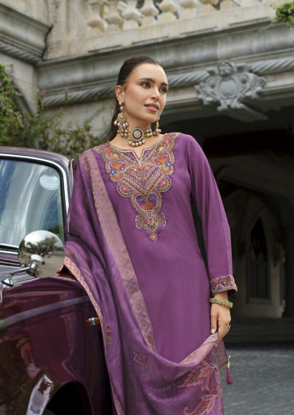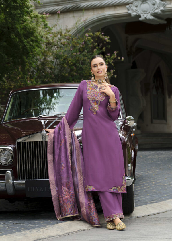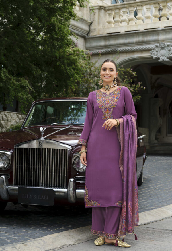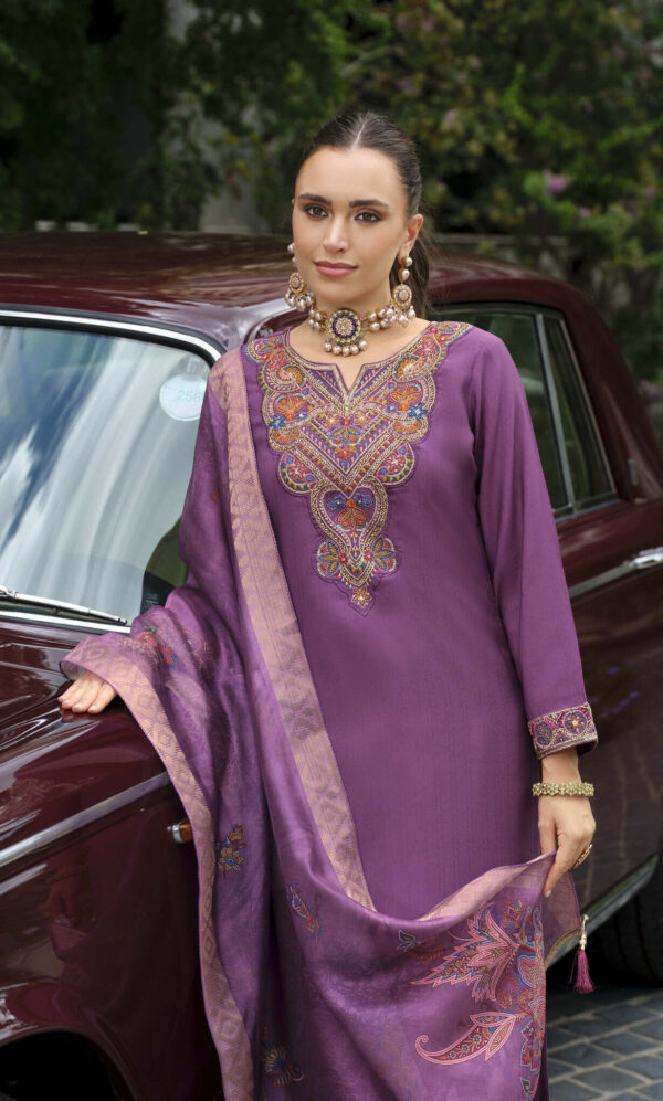 The Ibadat Purple 3-Piece Embroidered Suit is the ideal fusion of modern style and ethnic tradition. This Pakistani designer outfit includes a flared kurta adorned with detailed thread embroidery, complemented by embroidered trousers and a matching dupatta with elegant borders. Whether you’re attending a wedding, engagement, or festive event, this party wear salwar kameez set brings sophistication and charm to your ethnic wardrobe.