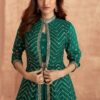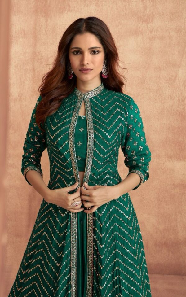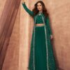 Elevate your style with this elegant Dark Green Indo Western impression dress, featuring a designer long jacket, embellished details, and a flowy skirt – perfect for weddings, parties, and festive celebrations.