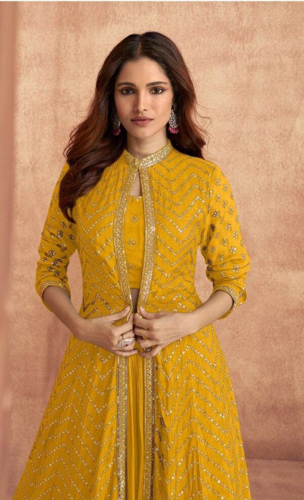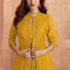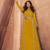 Elevate your style with this elegant Mustard Indo Western impression dress, featuring a designer long jacket, embellished details, and a flowy skirt – perfect for weddings, parties, and festive celebrations.