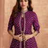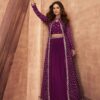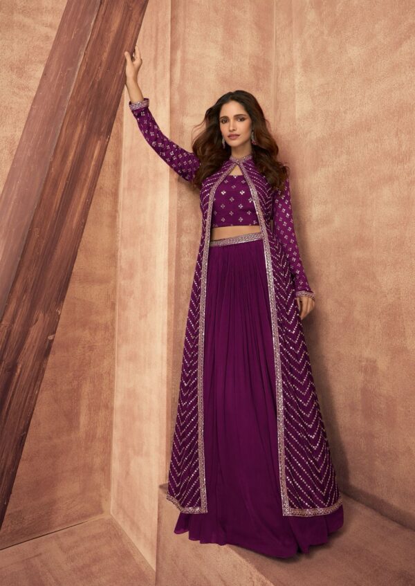 Elevate your style with this elegant purple Indo Western impression dress, featuring a designer long jacket, embellished details, and a flowy skirt – perfect for weddings, parties, and festive celebrations.