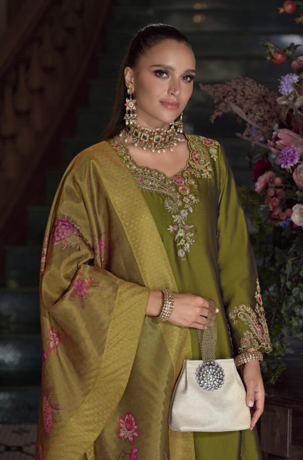 Ariana Designer Dark Green Simmer Silk Suit with Hand Embroidery & Floral Dupatta
