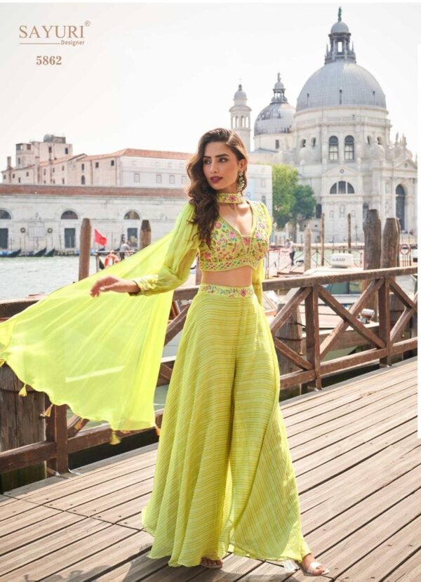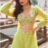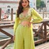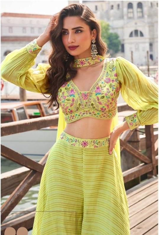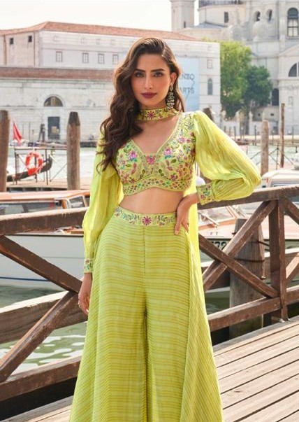 Turn heads in this Stunning Lime Naina Indo Western dress, featuring an embroidered crop top with stylish sleeves and a striped flowy Plazo – perfect for weddings, parties, and festive occasions.