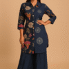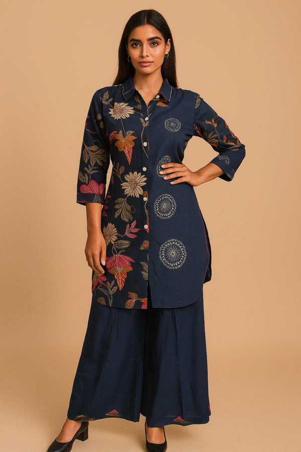Chic navy blue floral kurta with matching palazzo pants, crafted from breathable cotton for all-day elegance and effortless charm.