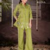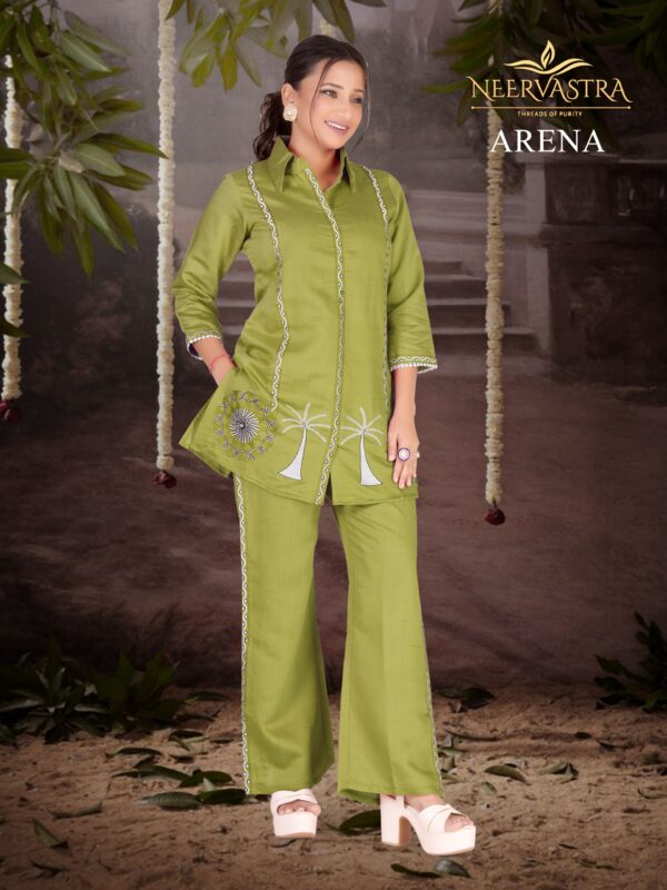 Neervastra Arena Green Embroidered Coord Set with matching palazzo pants, crafted from breathable cotton for all-day elegance and effortless charm.