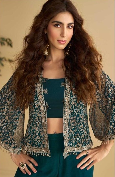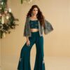 Elevate your festive style with this Nitya teal Indo Western palazzo set featuring an embroidered crop top, flared palazzo pants, and a designer printed jacket.