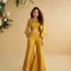 Elevate your festive style with this Nitya yellow Indo Western palazzo set featuring an embroidered crop top, flared palazzo pants, and a designer printed jacket.