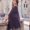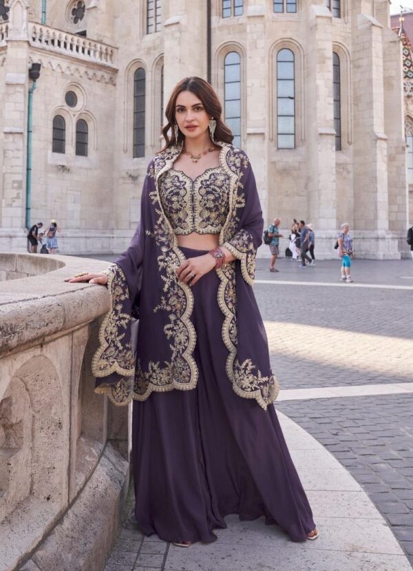 Step into timeless elegance with the Jannat Indo Western Dress. Featuring a regal purple palazzo set paired with a beautifully embroidered crop top and flowing cape, this outfit blends traditional charm with contemporary style—perfect for weddings, receptions, and festive occasions.
