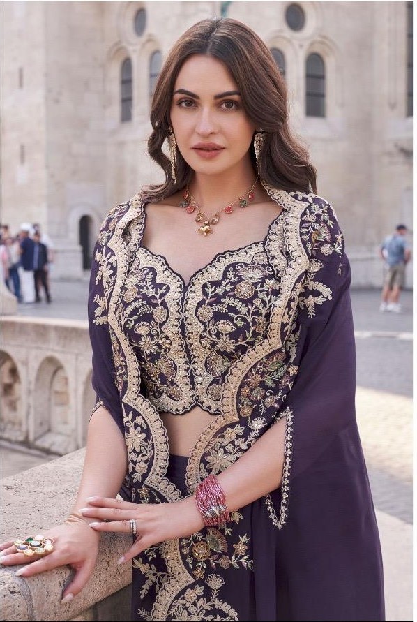 The Jannat Indo Western Dress is a statement of luxury and sophistication, designed for the modern woman who loves to blend tradition with contemporary fashion. Crafted in a rich deep purple hue, this ensemble features a finely embroidered crop top adorned with intricate golden threadwork, paired with wide-leg palazzo pants that flow effortlessly with every step.