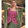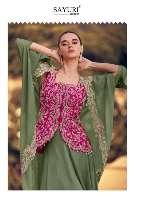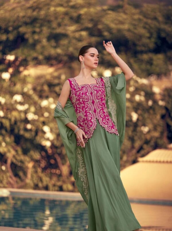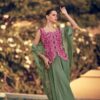 Elevate your ethnic wardrobe with the stunning Panihari Indo Western Designer Dress by Sayuri. Crafted with luxurious fabric, this outfit blends traditional Indian embroidery with a chic contemporary silhouette. The vibrant pink embroidered bodice adorned with delicate zari, thread, and sequins creates a royal charm, while the flowy green drape adds modern sophistication.