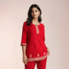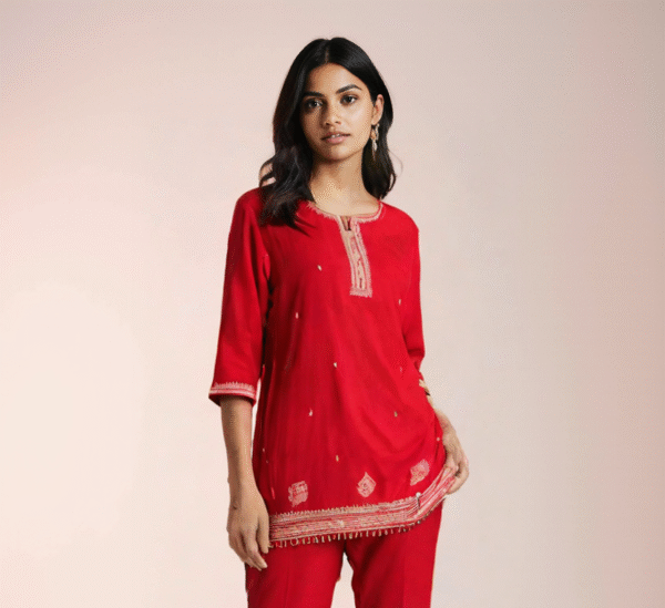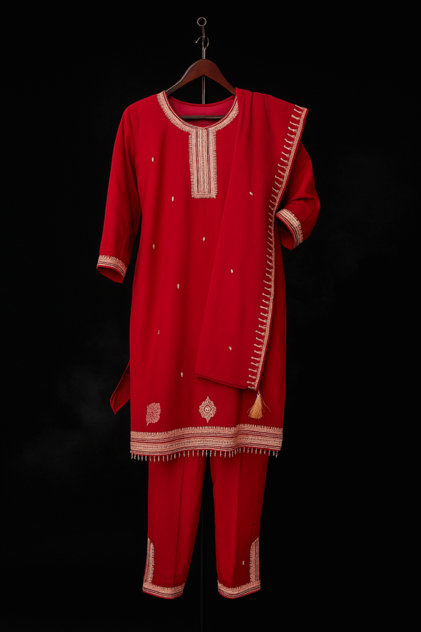 The straight-cut kameez is adorned with fine cream and gold thread embroidery, delicately placed across the neckline, sleeves, hem, and body, adding a graceful shimmer to the vibrant red base. Paired with matching trousers that mirror the embroidery detailing, the ensemble is completed with a finely finished dupatta featuring elegant edging and subtle motifs throughout.