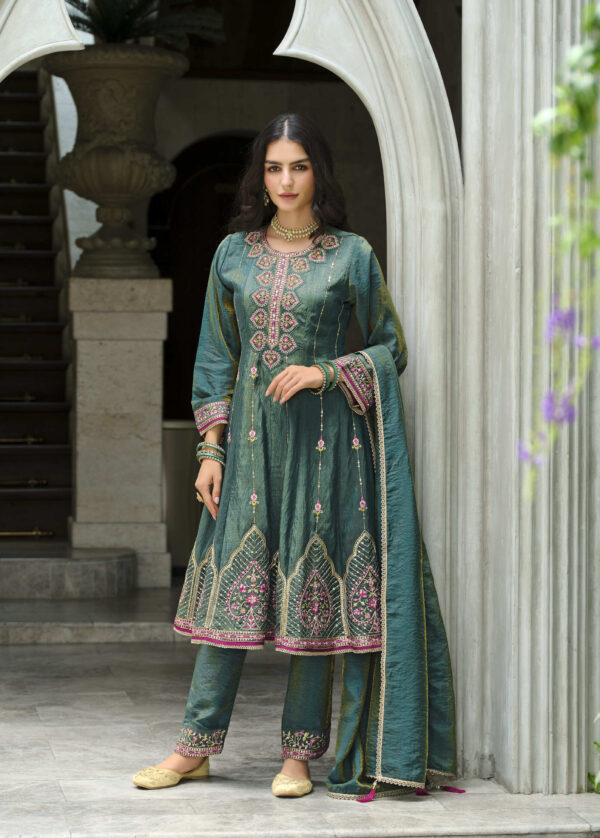 The Sajni Dark Green 3-Piece Embroidered Suit is the ideal fusion of modern style and ethnic tradition. This Pakistani designer outfit includes a flared kurta adorned with detailed thread embroidery, complemented by embroidered trousers and a matching dupatta with elegant borders. Whether you’re attending a wedding, engagement, or festive event, this party wear salwar kameez set brings sophistication and charm to your ethnic wardrobe.