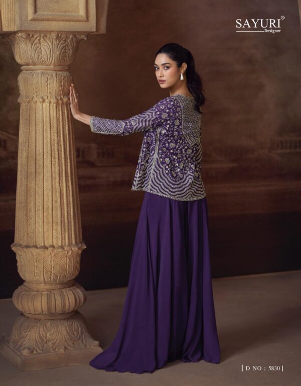 Silky Purple Designer Dress - Embroidered Crop Top with Palazzo & JacketSilky Purple Designer Dress – Embroidered Crop Top with Palazzo & Jacket