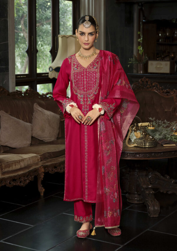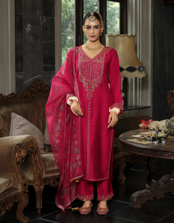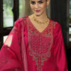 Elevate your festive wardrobe with this luxurious Sindoor dark red 3-piece embroidered suit, featuring a finely detailed kurta, matching trousers, and an elegant dupatta. Perfect for weddings, parties, and traditional celebrations.