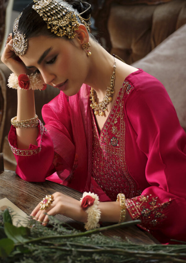 Step into timeless elegance with our Sindoor dark red embroidered 3-piece suit, designed for women who love a royal yet graceful look. This designer outfit includes a beautifully embroidered kurta with intricate detailing on the neckline and sleeves, paired with matching trousers and a rich dupatta adorned with delicate floral patterns.