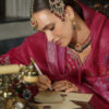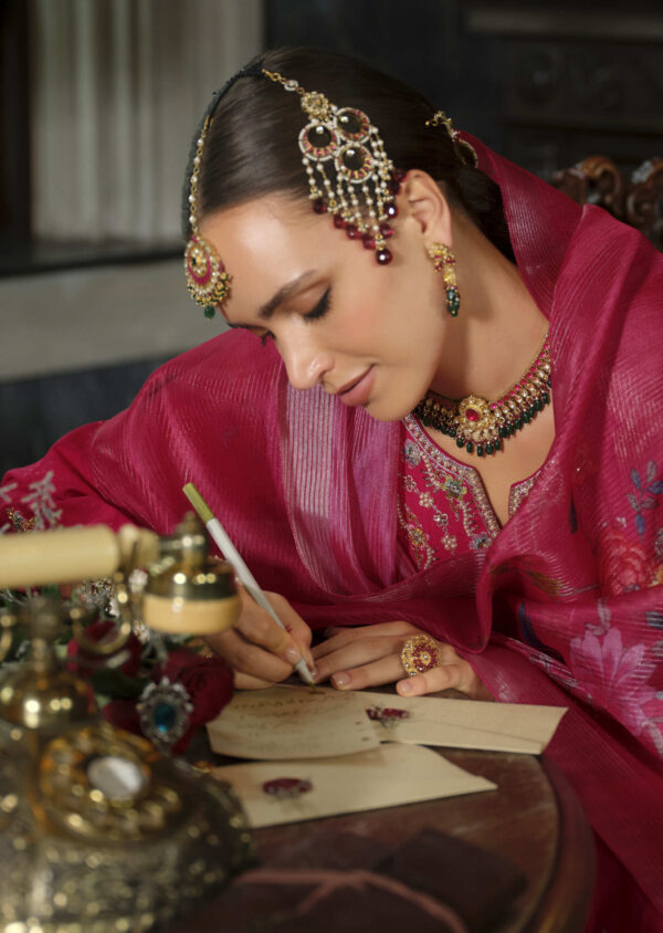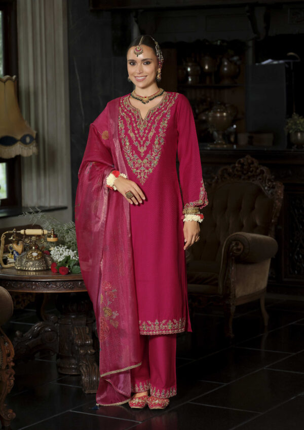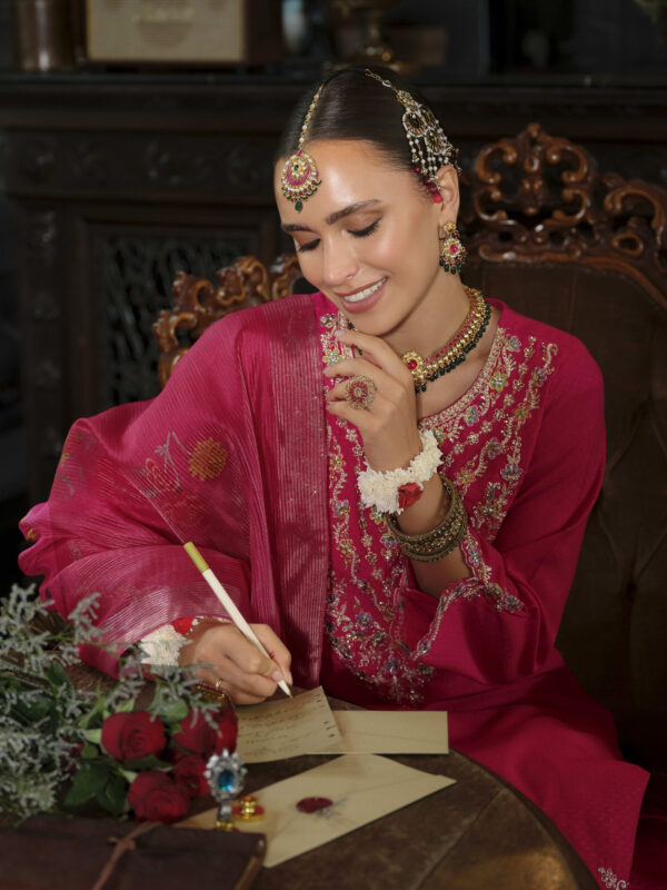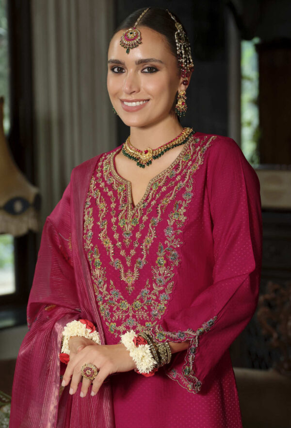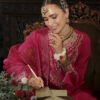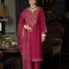 Elevate your festive wardrobe with this luxurious Sindoor Mahroon embroidered suit, featuring a finely detailed kurta, matching trousers, and an elegant dupatta. Perfect for weddings, parties, and traditional celebrations.