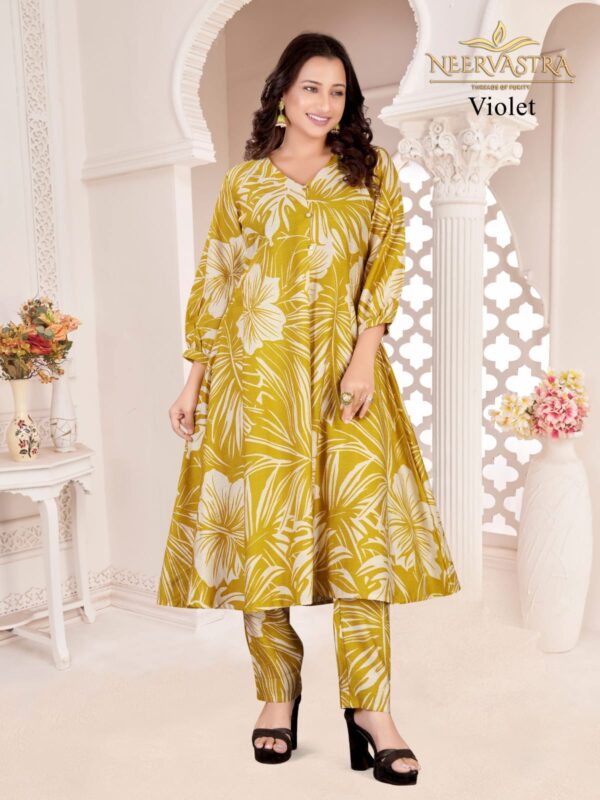 Upgrade your ethnic wardrobe with this elegant Mustard floral print co-ord set for women from Neervastra Violet Collection. Perfect for festive wear, parties, and casual outings